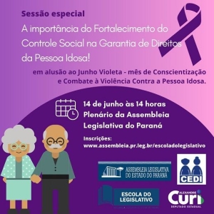O Presidente da Assembleia Legislativa do Estado do Paraná, Deputado ADEMAR LUIZ TRAIANO, tem a honra de convidar para a Sessão Solene “A Importância do Fortalecimento do Controle Social na Garantia de Direitos da Pessoa Idosa” por proposição do Deputado ALEXANDRE CURI – 1° Secretário, e da ESCOLA DO LEGISLATIVO, em parceria com o Conselho Estadual dos Direitos do Idoso do Paraná, com início às 14 horas do dia 14 de junho de 2023, no Plenário desta Casa de Leis. Clique aqui e acesse o convite.