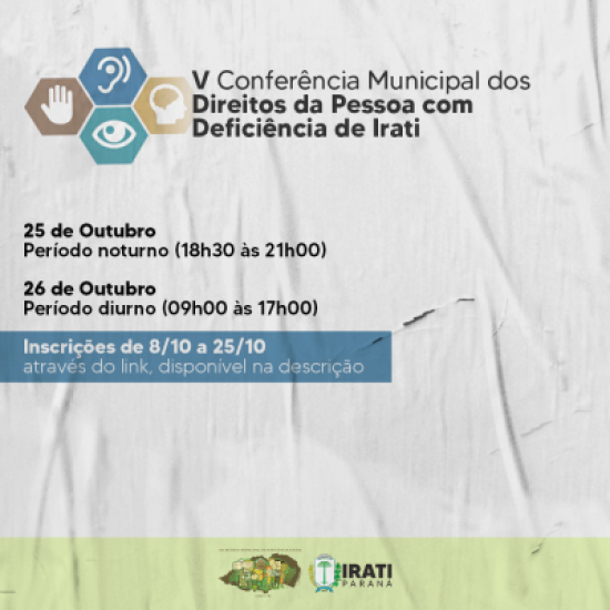 A Conferência é uma ação da Secretaria de Assistência Social em conjunto com o Conselho Municipal dos Direitos da Pessoa com Deficiência de Irati. Na segunda-feira (25), o evento ocorrerá no período noturno. Já na terça (26), será o dia todo, no formato online, com sua transmissão ao vivo pela página do Facebook da Prefeitura.